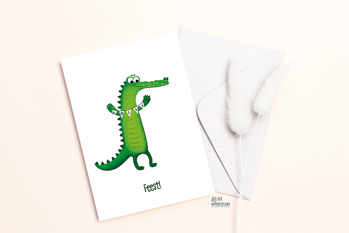Hoera! Deze vrolijke krokodil is helemaal klaar voor feest.